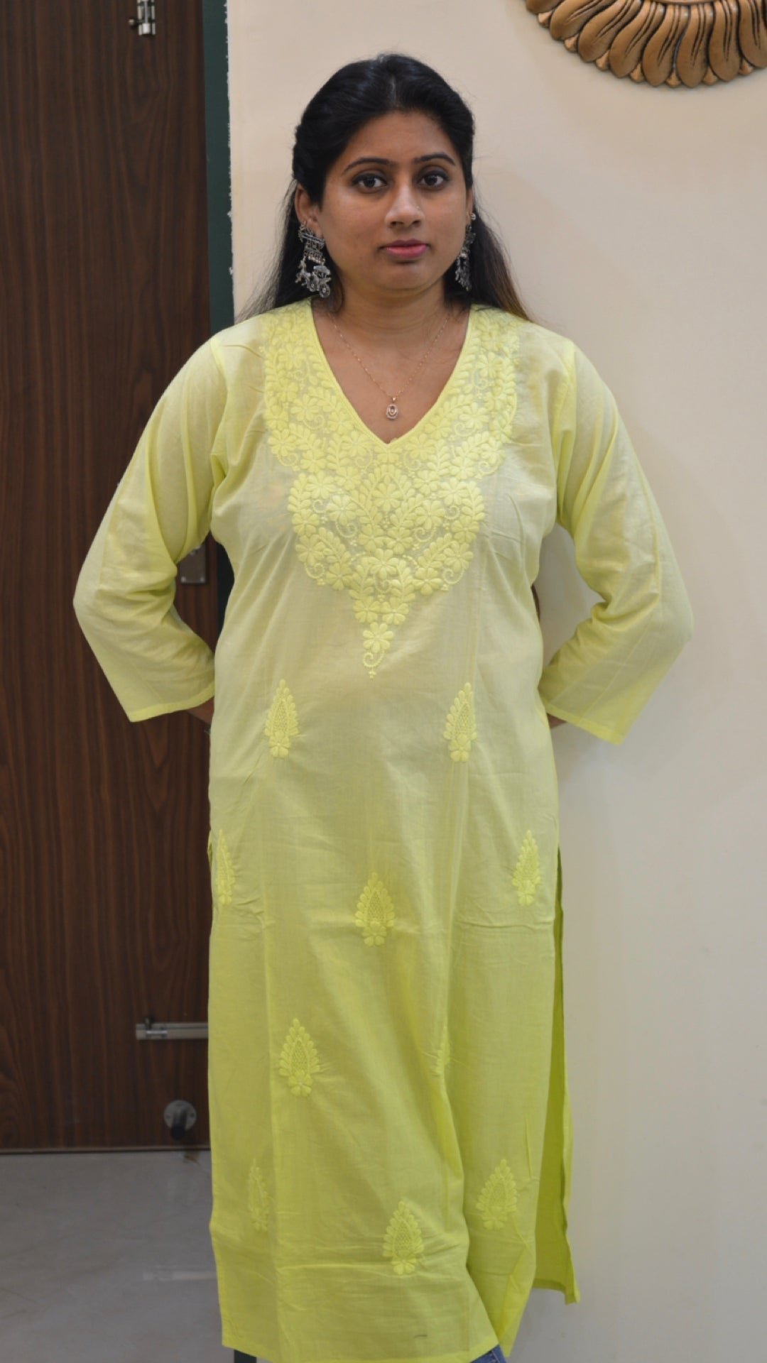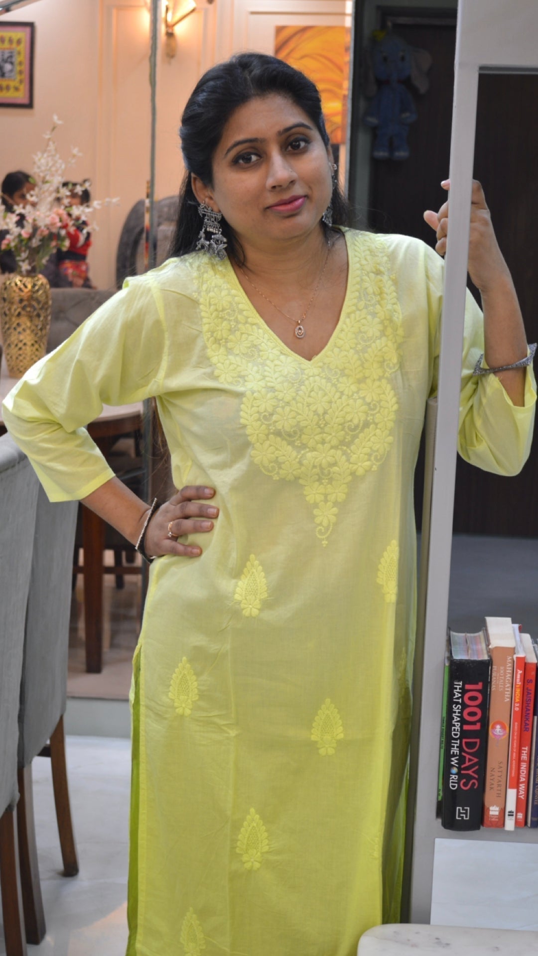 A graceful neon long kurti with delicate Chikankari embroidery on the neckline. Made from soft pure cotton, ensuring style with comfort.